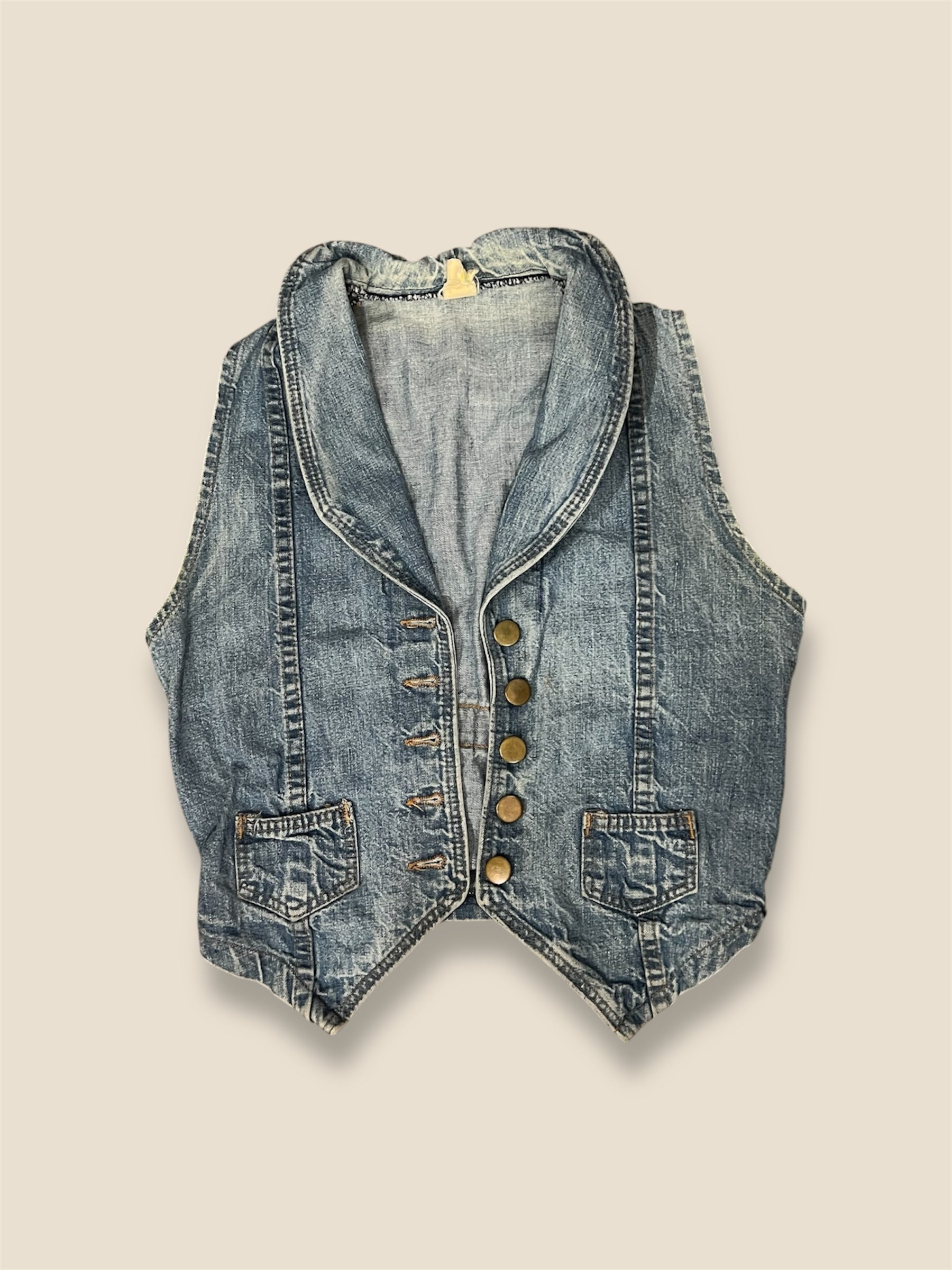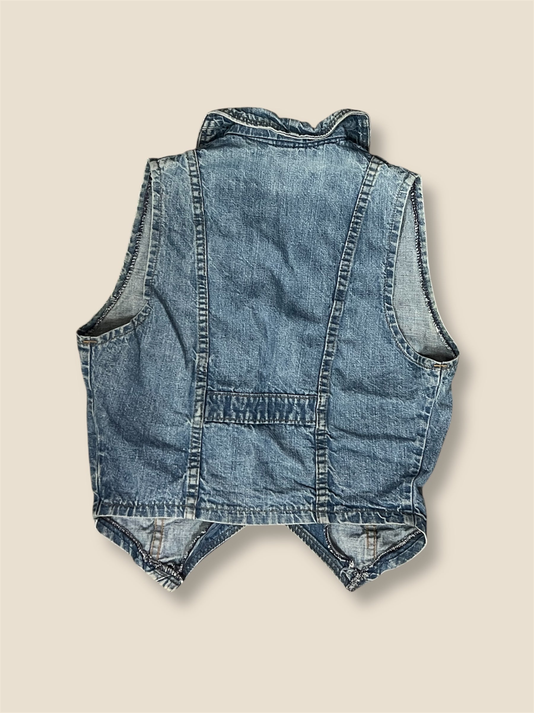 Blue denim button up vest. A few stains throughout, can be stain treated.