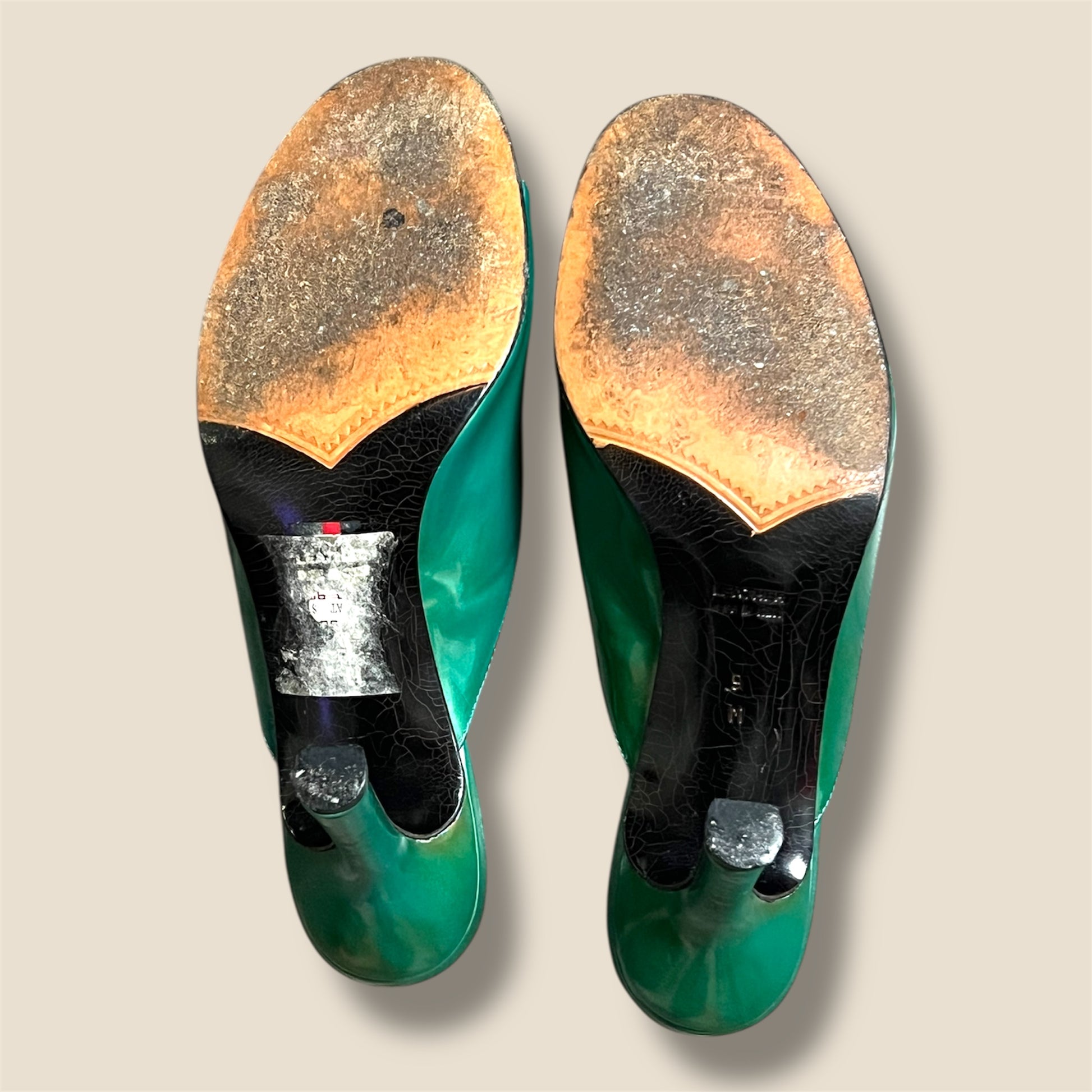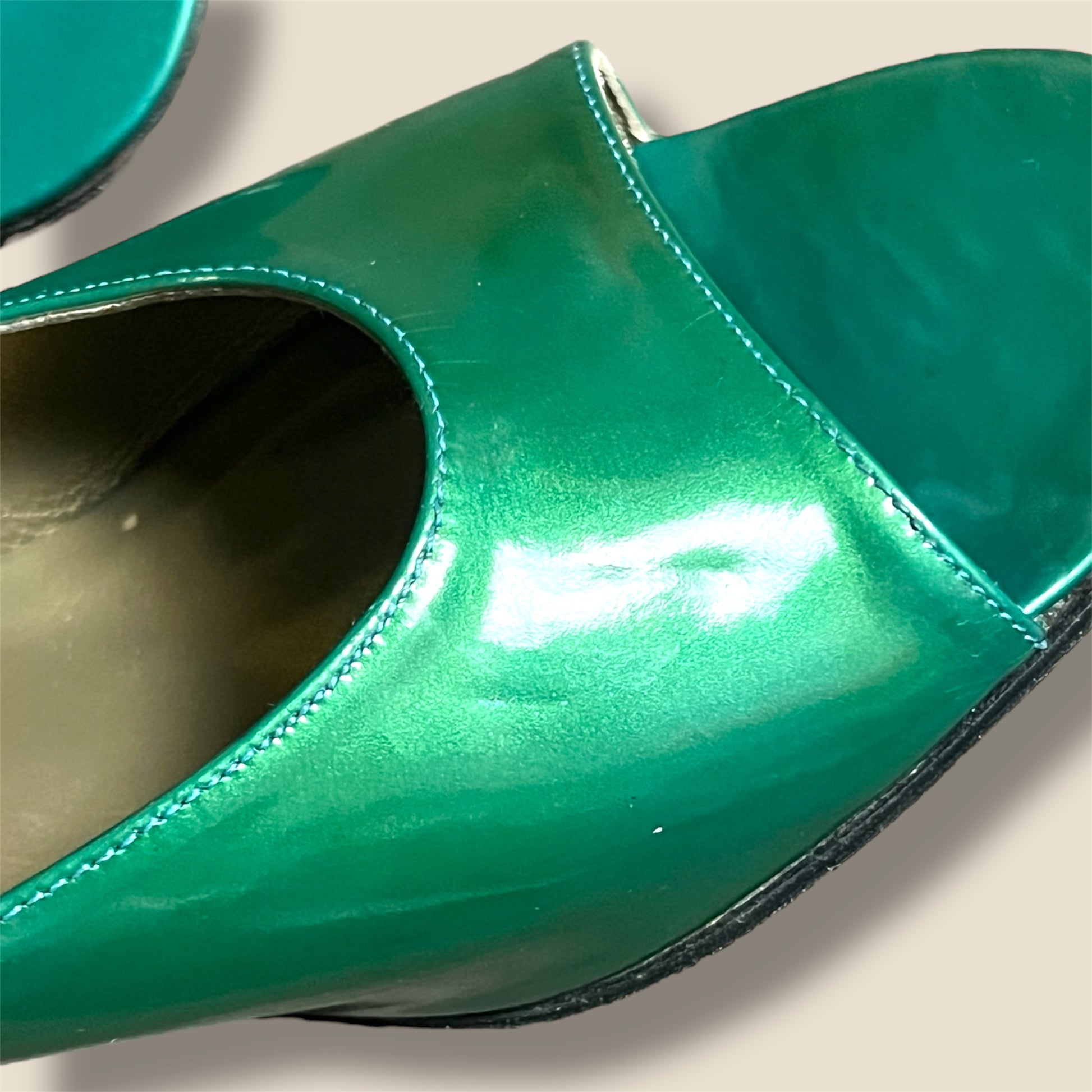 Vintage green patent leather slip on sandal heels by YSL. Signs of ware, still have a ton of life left in them!
