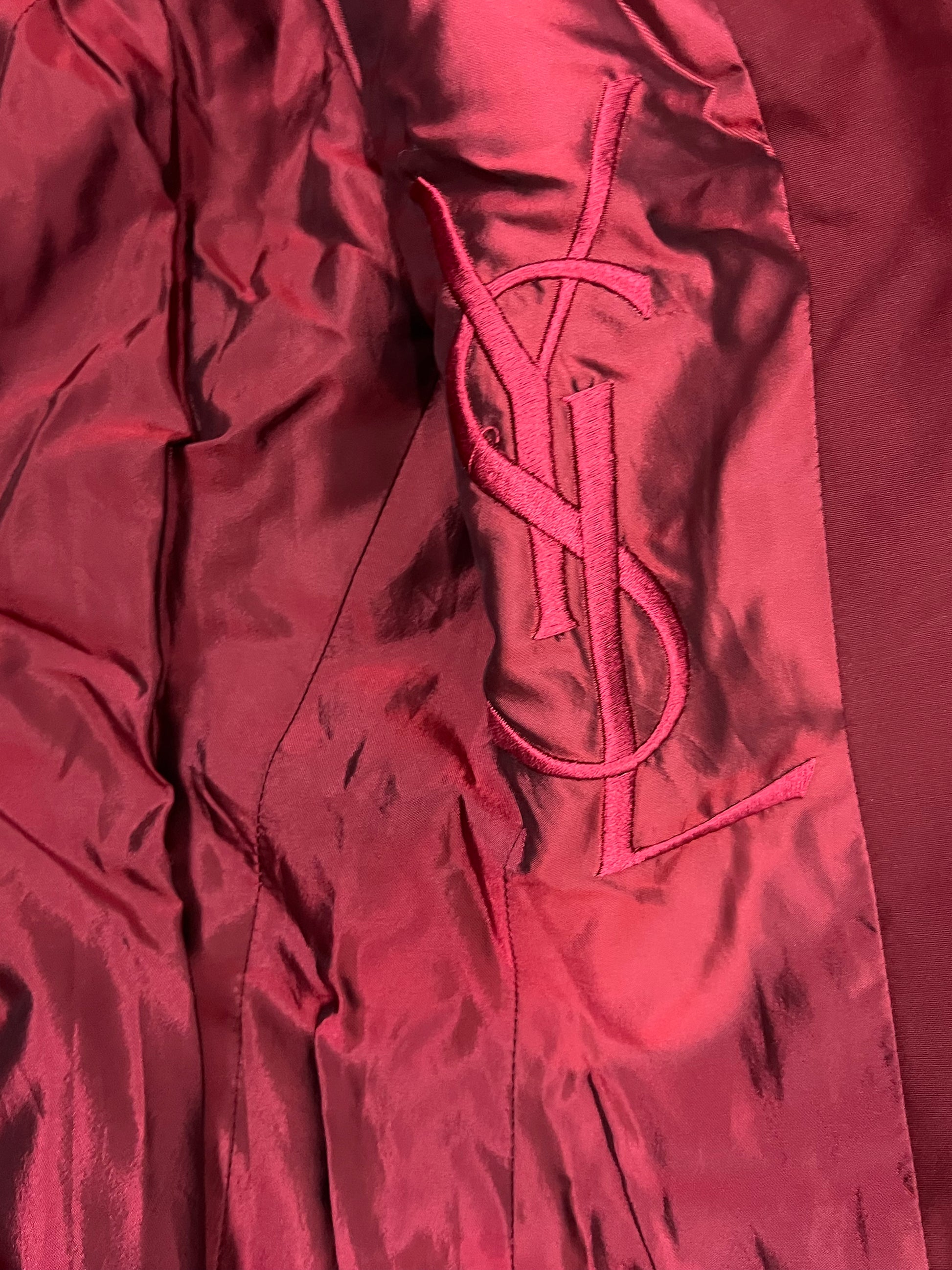Stunning vintage YSL blazer in a deep red, almost burgundy hue. YSL embroidery detail on inside. Exaggerated shoulder pads. faux pocket details and single button closure.